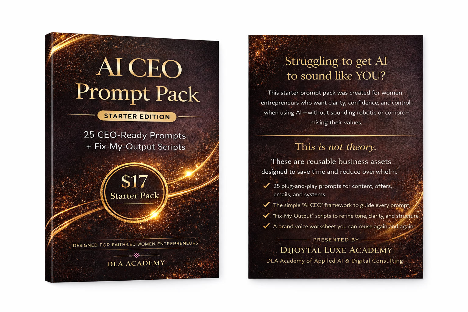 This Starter Edition gives you 25 CEO-ready prompts, fix-my-output scripts, and a simple framework to help AI sound like you. If the free Quickstart gave you clarity, this pack gives you consistency. One-time payment • Instant access • $17 No subscription. Use it anytime.